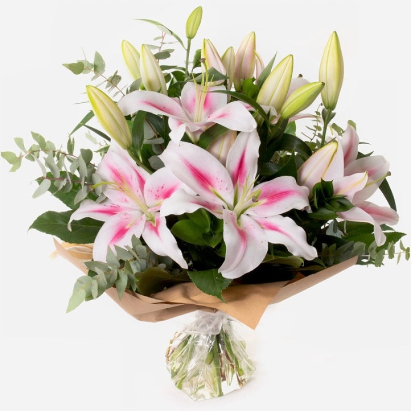 Elegant and long-lasting, this hand-tied bouquet of pink Oriental lilies is a gift of pure serenity.